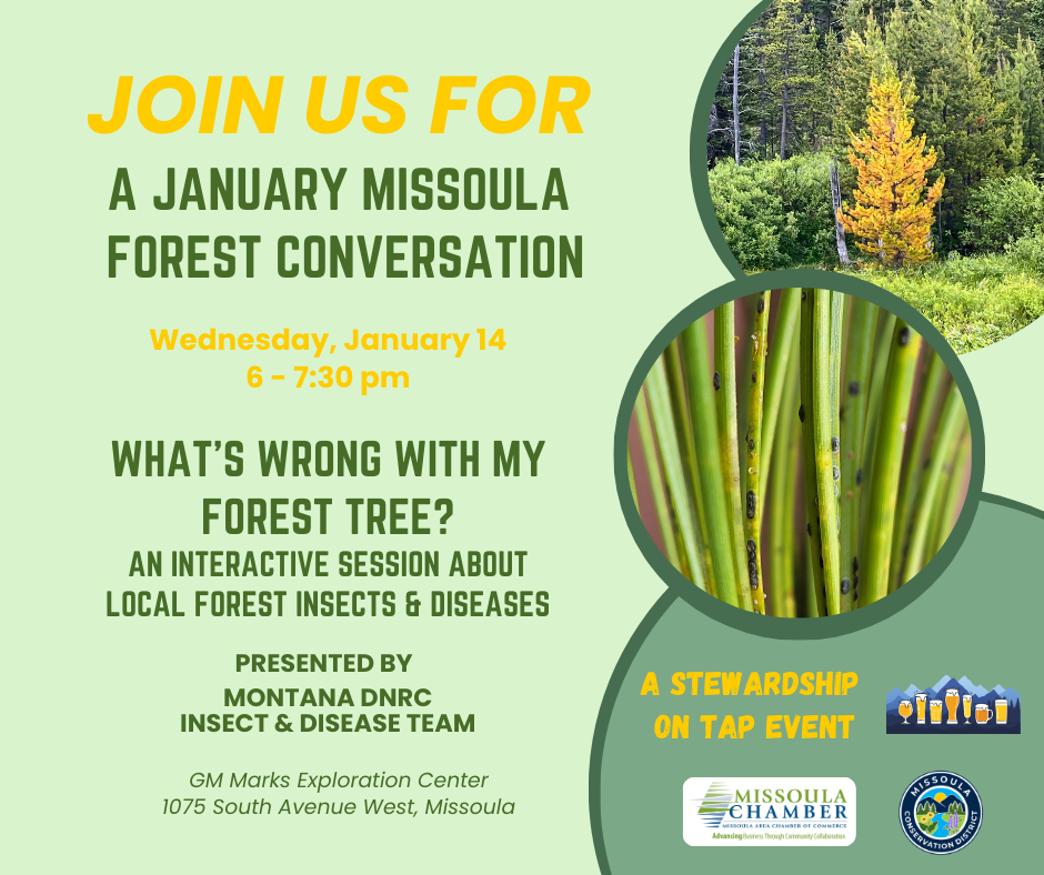 The first Forest Conversations event of 2026 will feature the Montana DNRC Insect and Disease Team exploring and answering, What is wrong with my forest tree? Amy Gannon, Jake Chadwell, and Rose Picklo will deliver an interactive session about our local forest insects and diseases. This event is free and open to the public. All attendees will receive a free beverage donated by the Missoula Chamber of Commerce.
