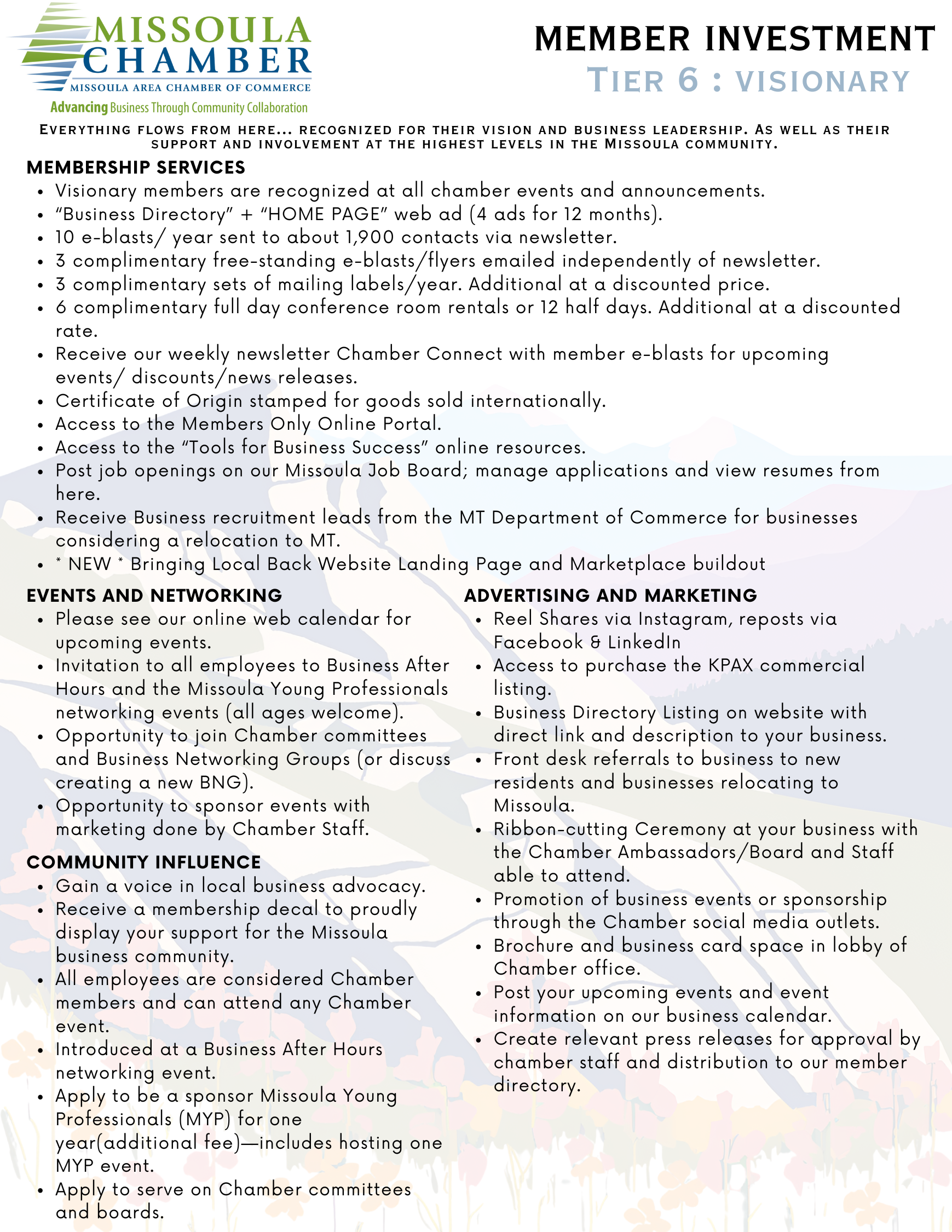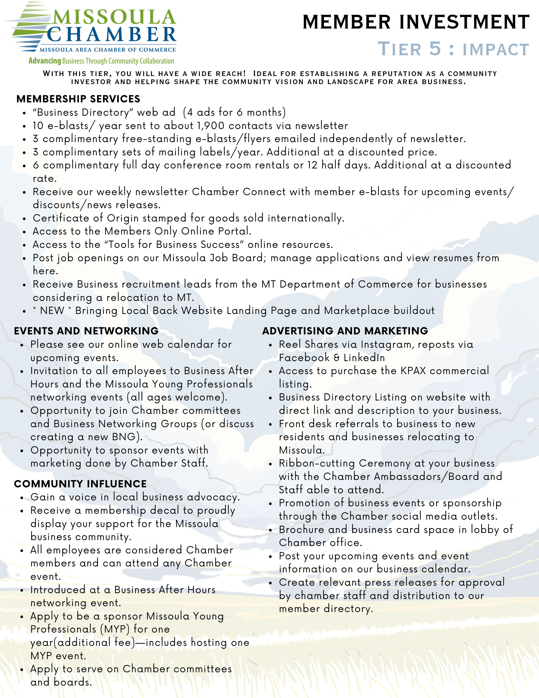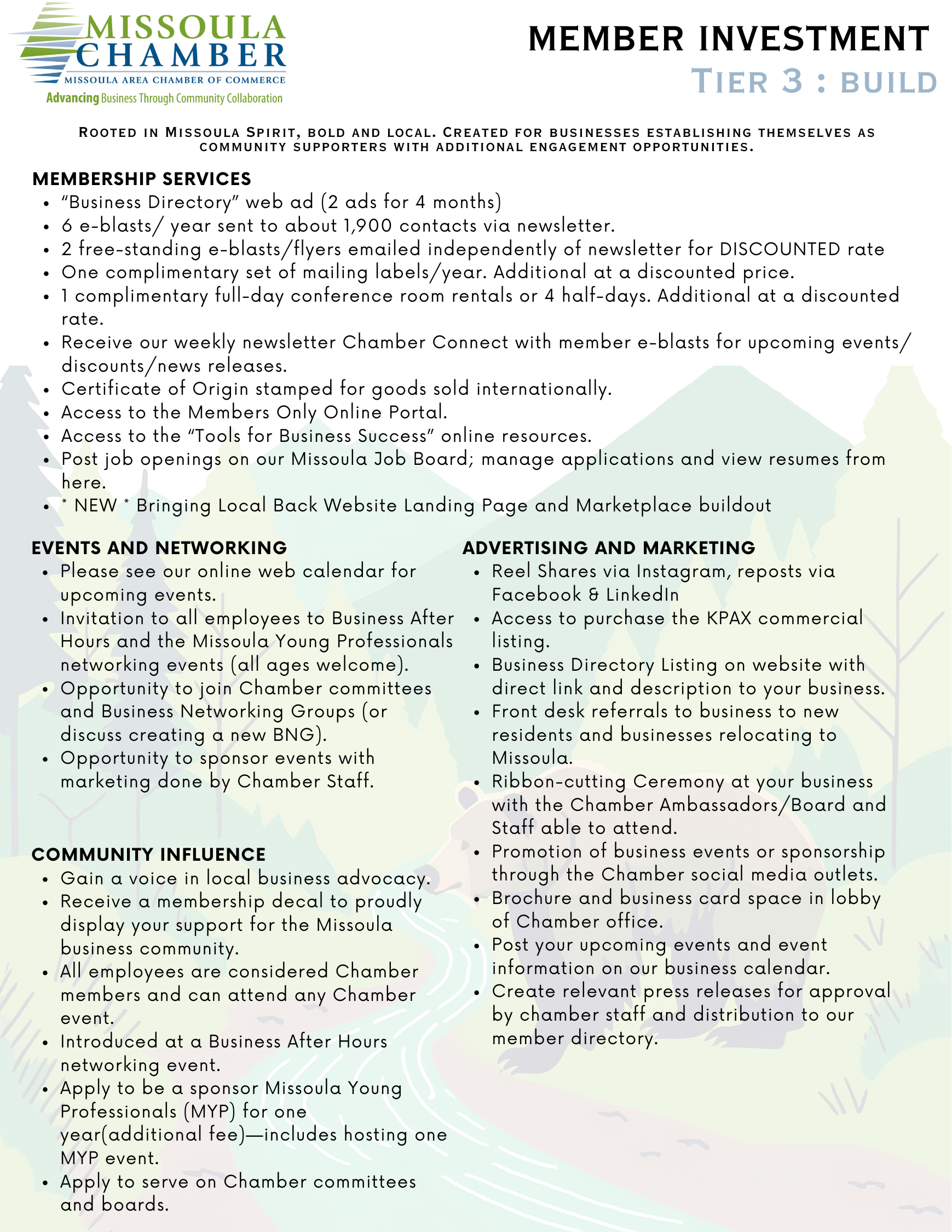 Our membership tiers are tailored to accommodate any organization, from national corporations to budding entrepreneurs. To find the best fit for your business, contact our Membership Director, Sharon Morren, at SharonM@missoulachamber.com or (406) 493-7969. We are consistently updating our tiers and value your input.
