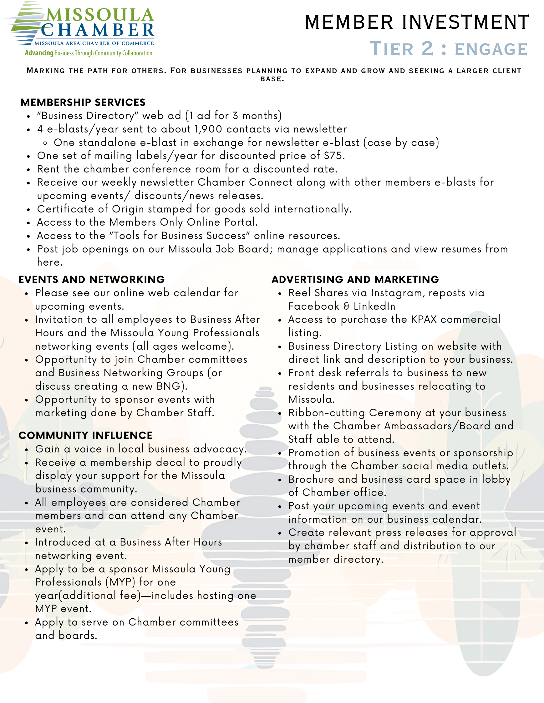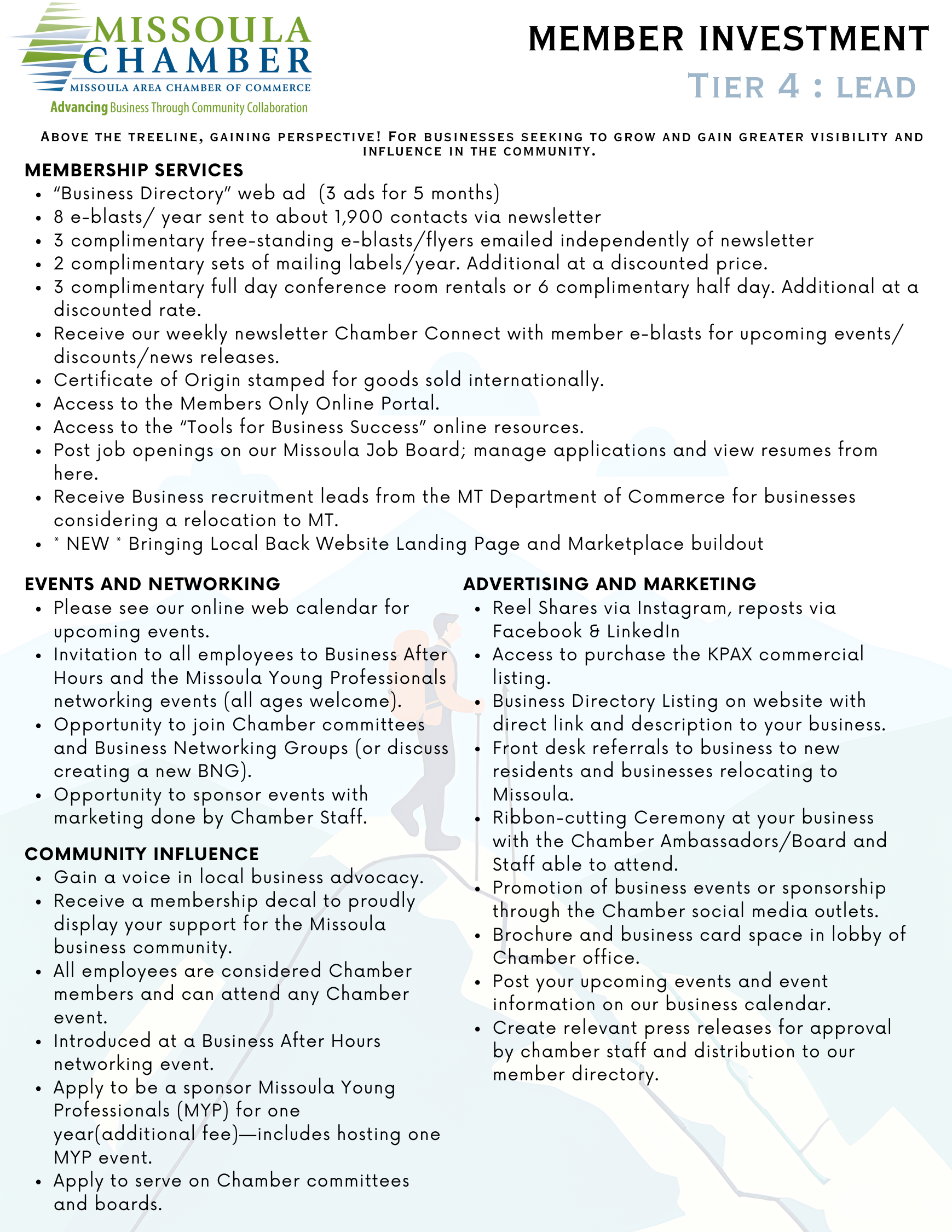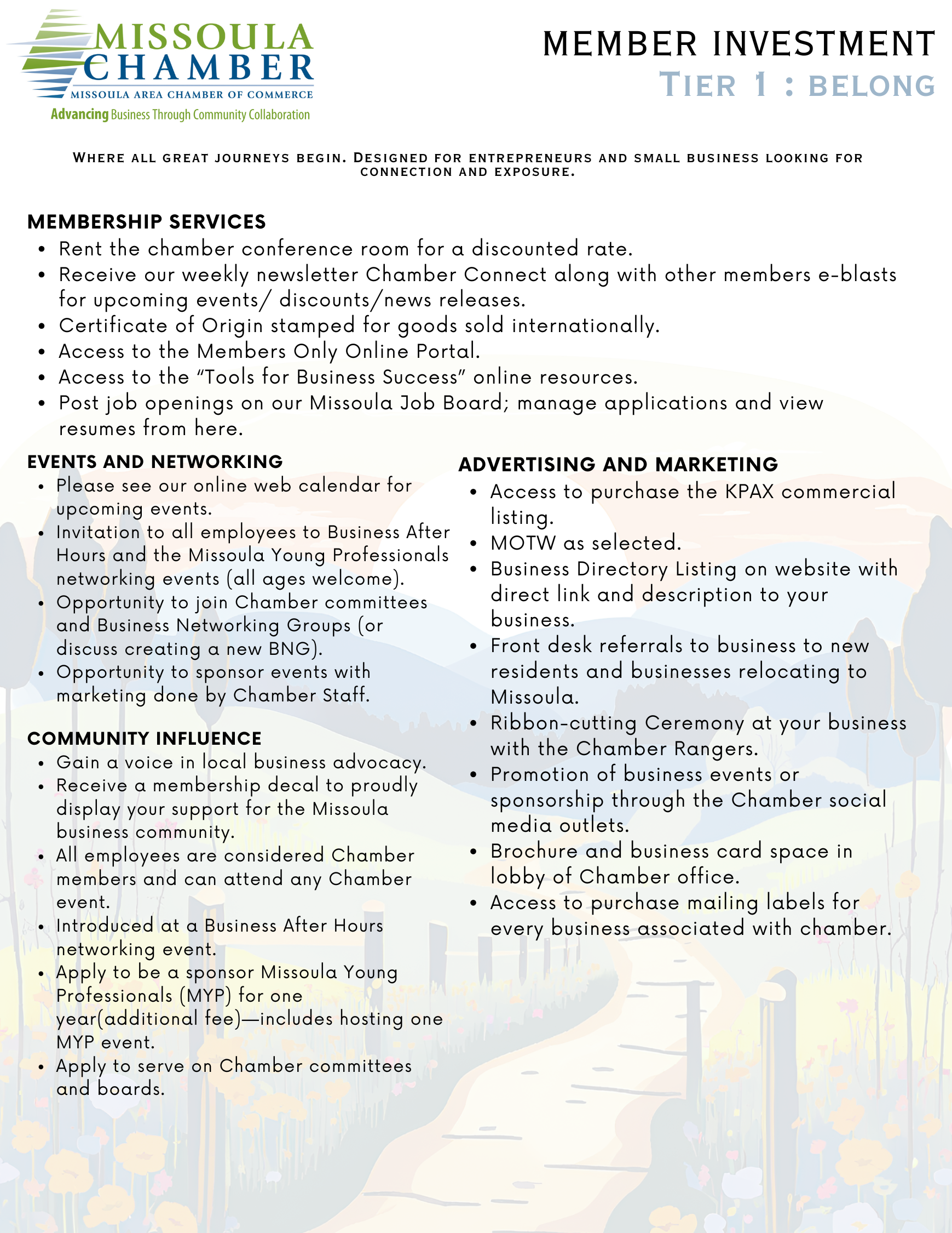 Our membership tiers are tailored to accommodate any organization, from national corporations to budding entrepreneurs. To find the best fit for your business, contact our Membership Director, Sharon Morren, at SharonM@missoulachamber.com or (406) 493-7969. We are consistently updating our tiers and value your input.